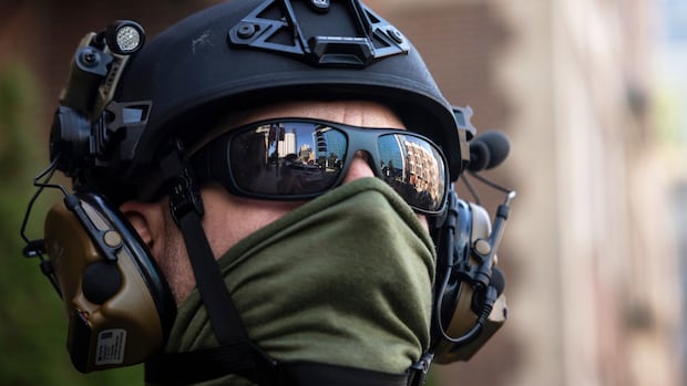 Protestors confront a federal agent during tense standoffs in Chicago over the weekend. Armed, camouflaged and masked border patrol agents have been roaming the streets of Chicago as Trump continues to ramp up their presence across the country. (Jim Vondruska/Reuters)